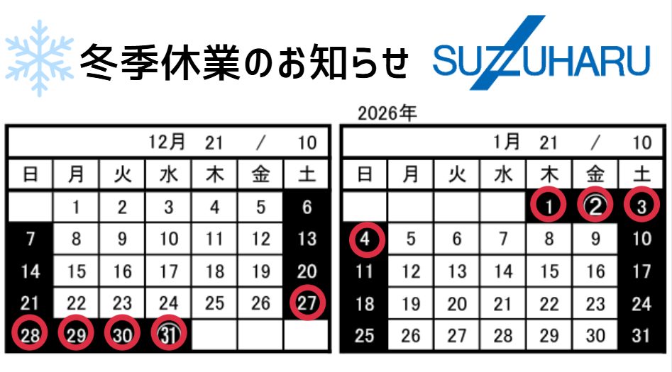 お気に入り追加 ニュース 冬季休業のお知らせ 2025年12月15日 webmaster-suzuharu 12月27日(金)から1月4日(日)まで冬季休業に入ります。 ご不便ご迷惑をおかけしますがよろしくお願いいたします。