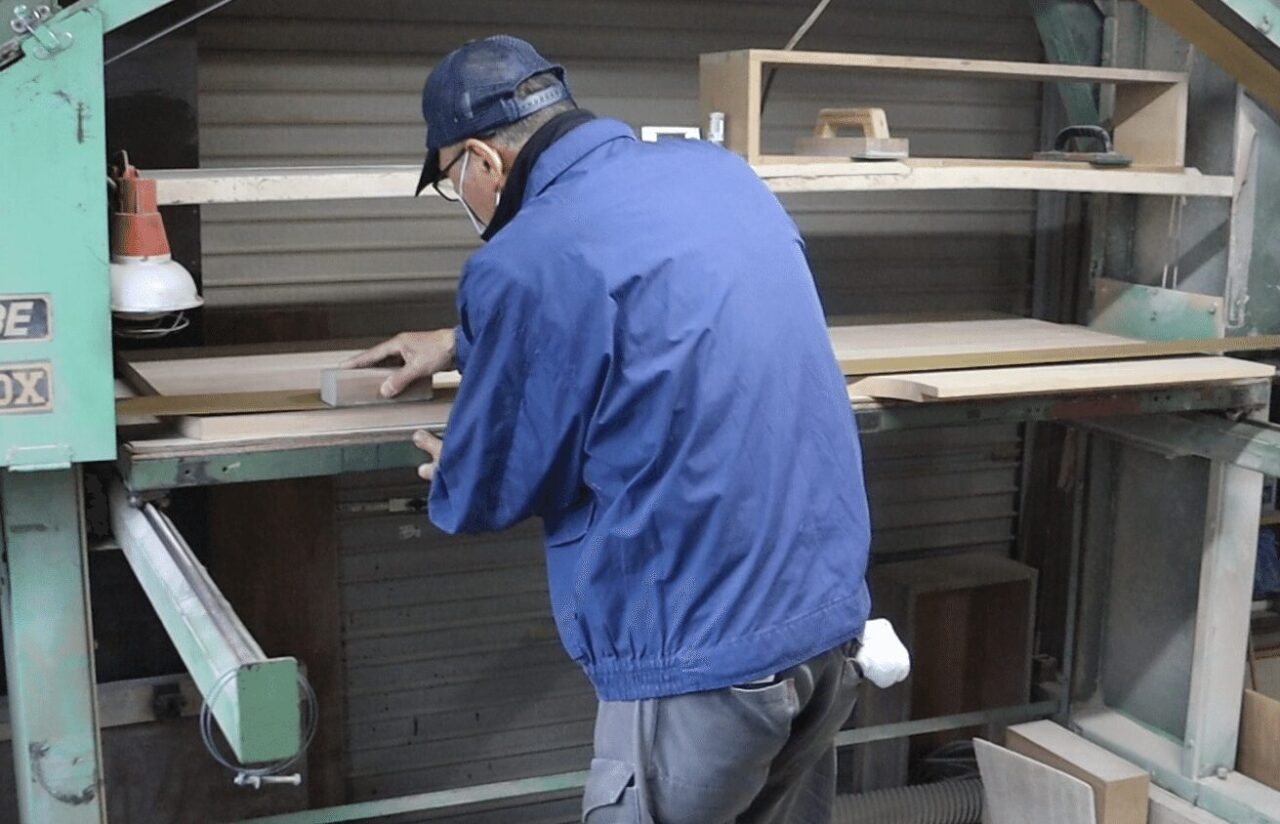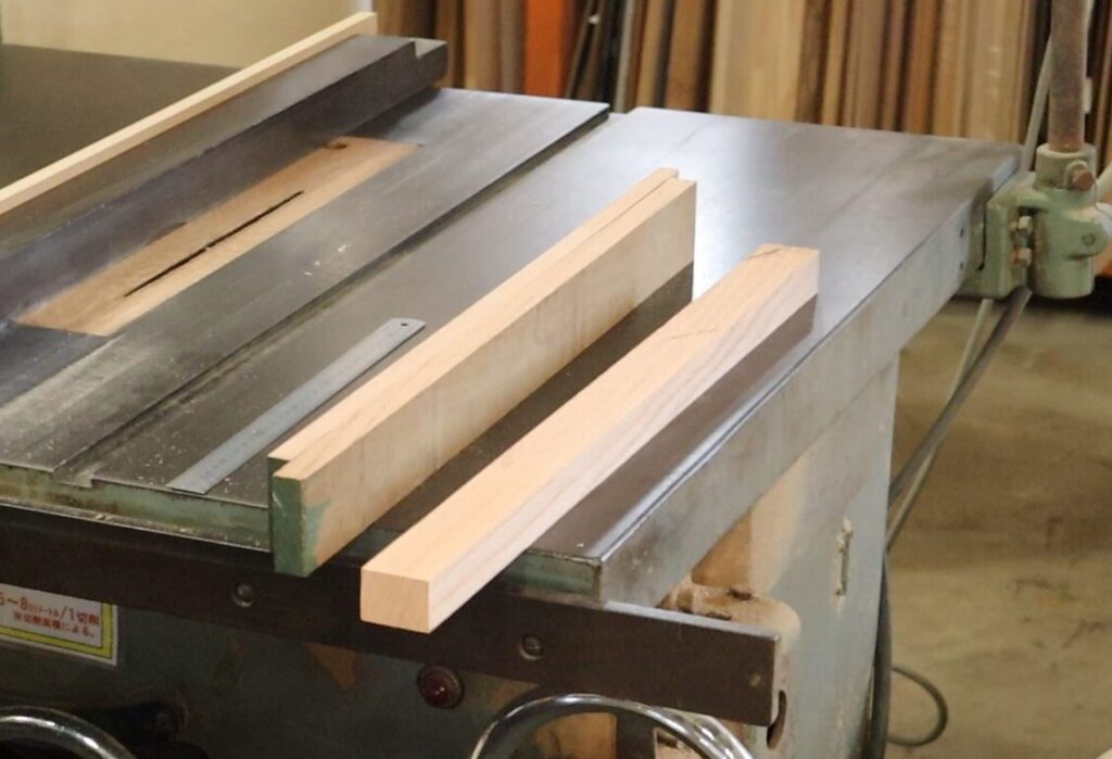 天板を留めるための壁に打つ板材を傾斜盤でカットします。