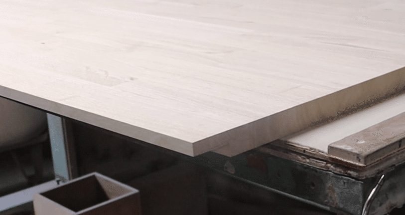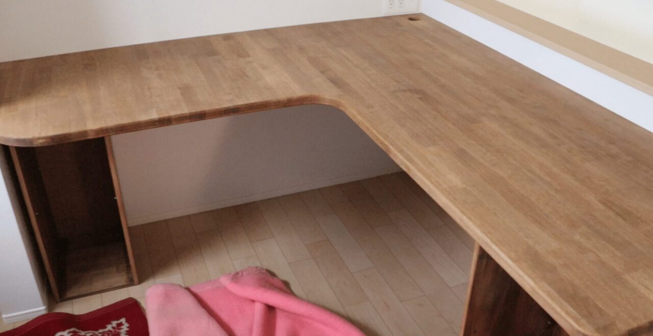 2枚の天板を剥ぎ合わせ、L字デスクが出来上がりました。
